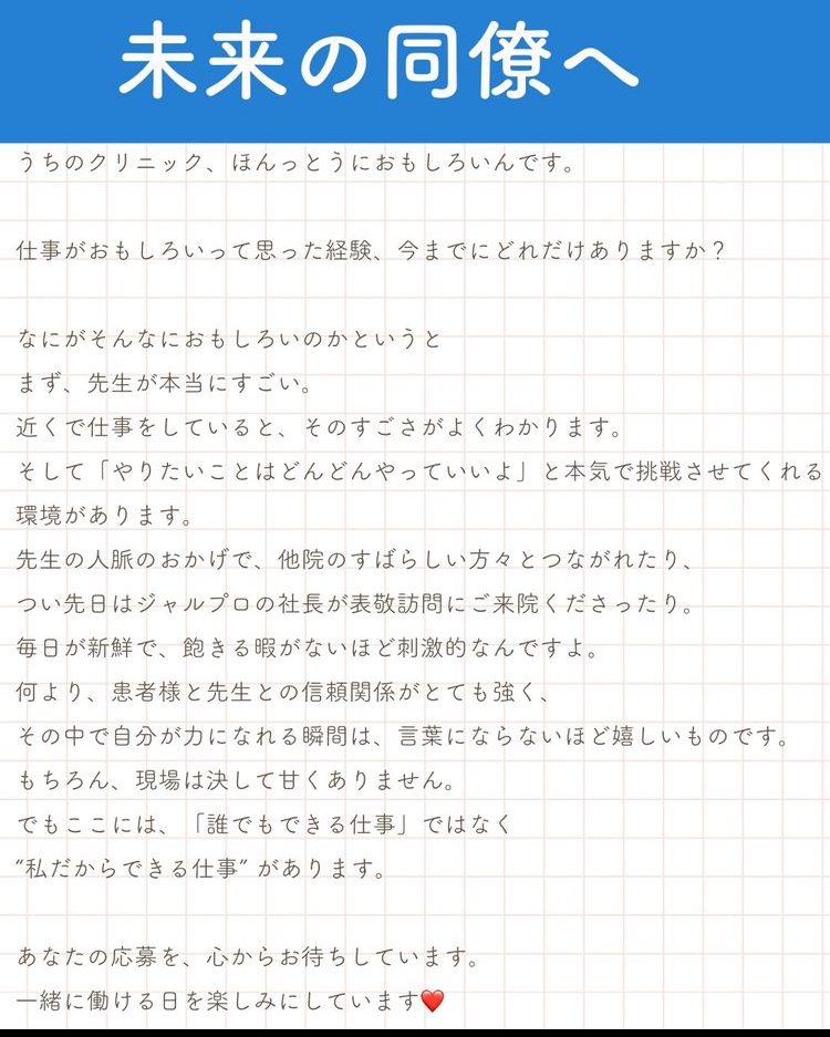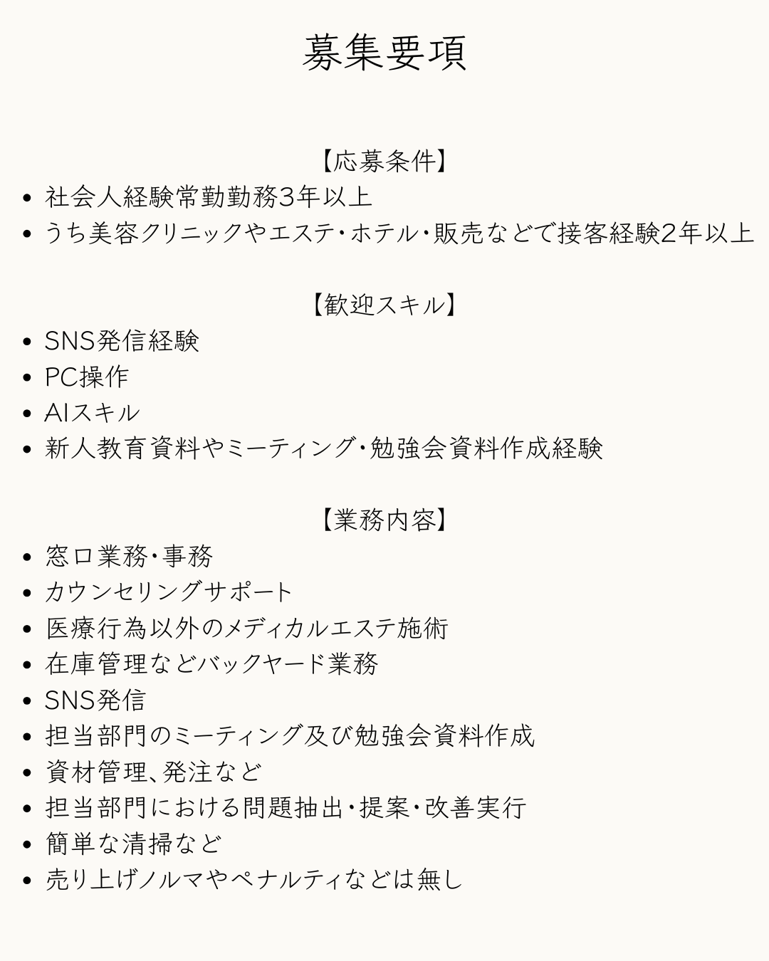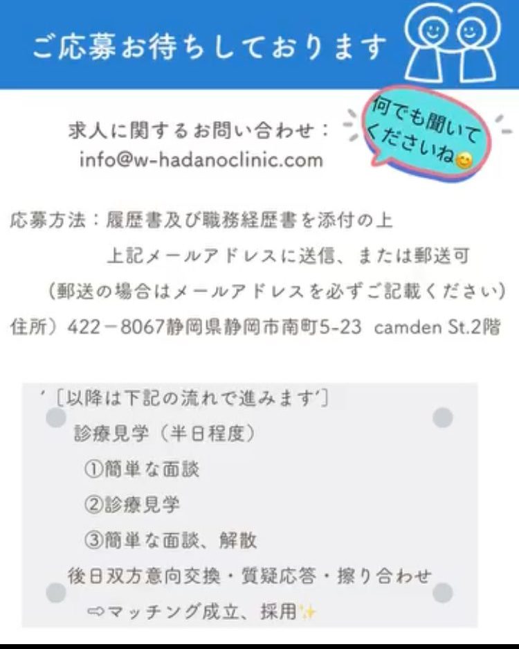 求人・他 現在受付(メディカルコーディネーター&メディカルセラピスト)1名募集中です(2025.12.8~) 【スタッフからアドバイス】 【業者の方へ】 セールス勧誘など含め面会・お電話のお取次ぎ・メール対応などは一切お断りしております。 ご契約済みの業者様の面会はアポイントをお取りください。