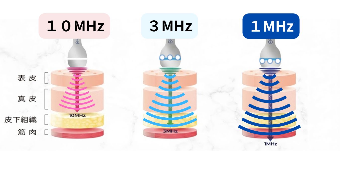 3つの周波数を用いて皮膚はもちろんのこと皮下深層まで効率的にアプローチします