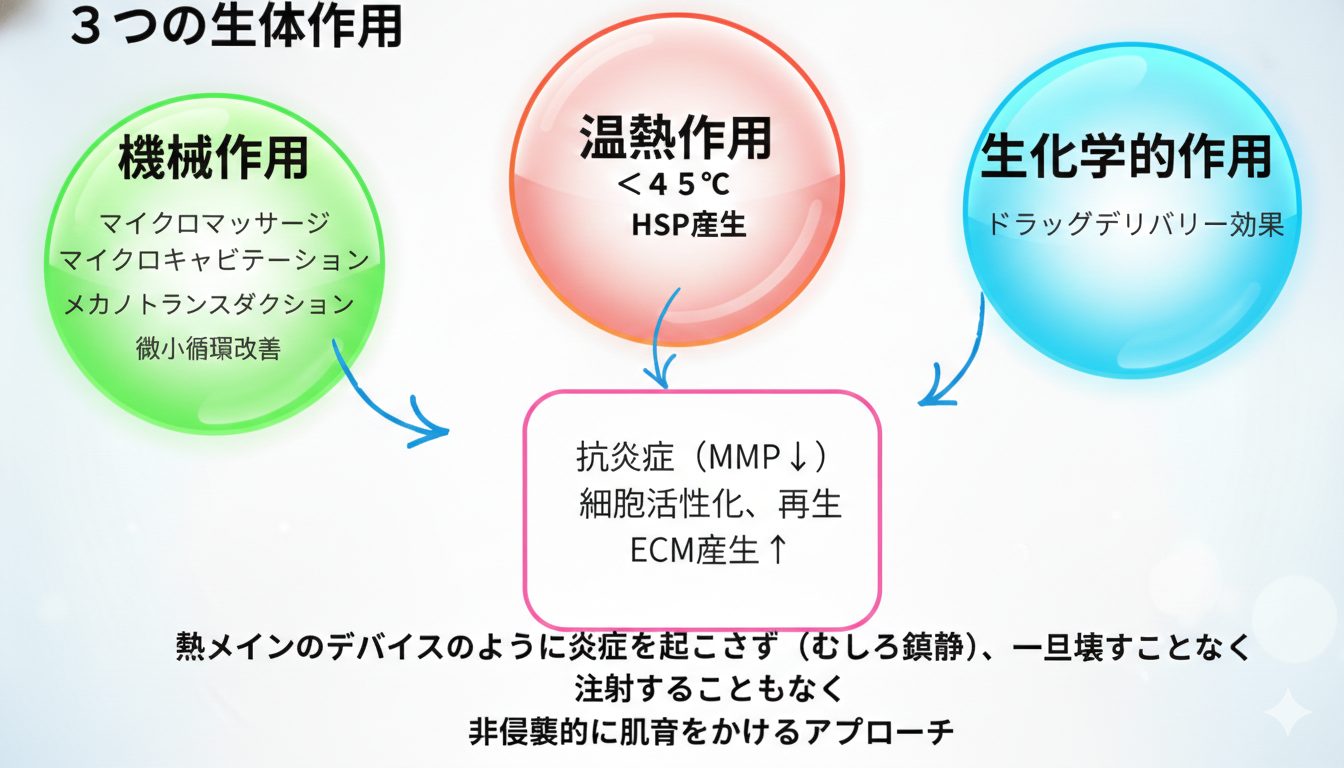 高密度の超音波エネルギーは、肌内部で3つの重要な働きをします。