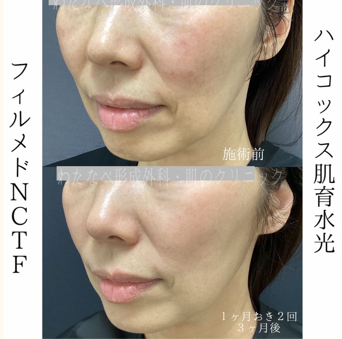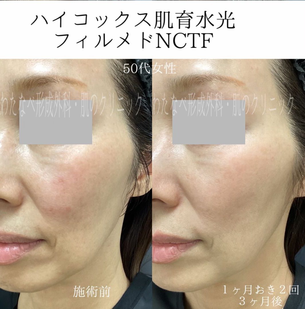 - 直後は薬剤による細かなぼこつきや内出血を認めます。ぼこつきは翌日にはほとんど落ち着いています。内出血は1-2週間ほどで徐々に消退していきます。翌日からはメイクでカバーしていただいてOKです。